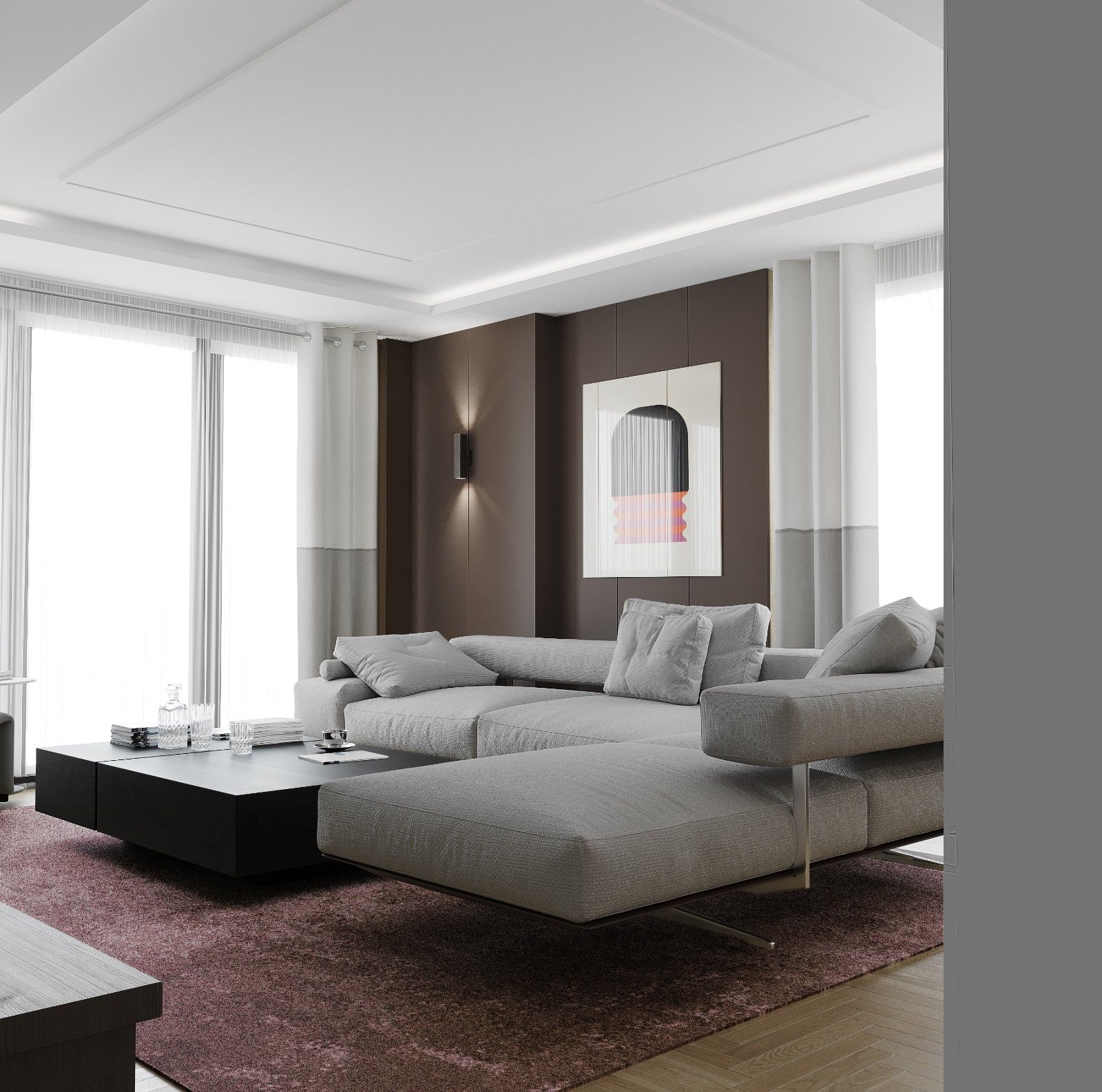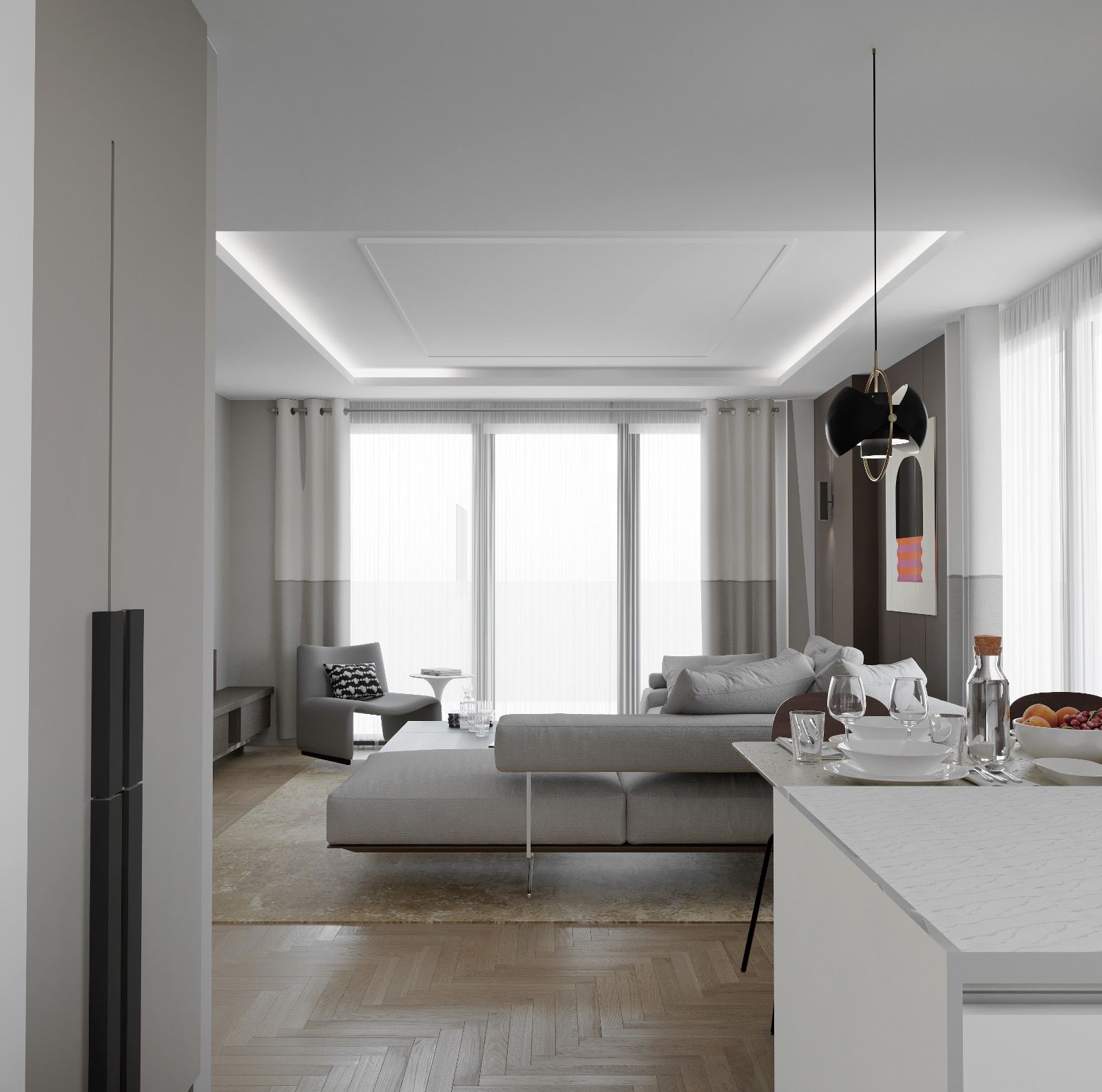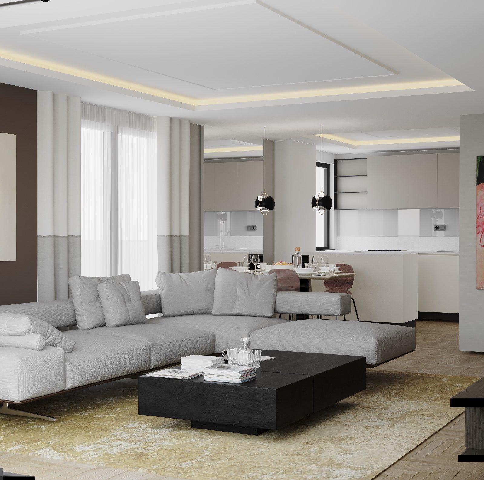 Nötr renk paletiyle zenginleşen mekân, doğal ahşap dokuları ve aydınlatma detaylarıyla sıcak bir atmosfer sunuyor. Ferah ve aydınlık yaşam alanlarında konforlu ve huzurlu anlar sizleri bekliyor.